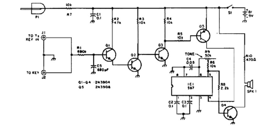 This code practice circuit was found in a 1990s issue of Radio Amaterur Today magazine. It produces an audio tone with the 555.