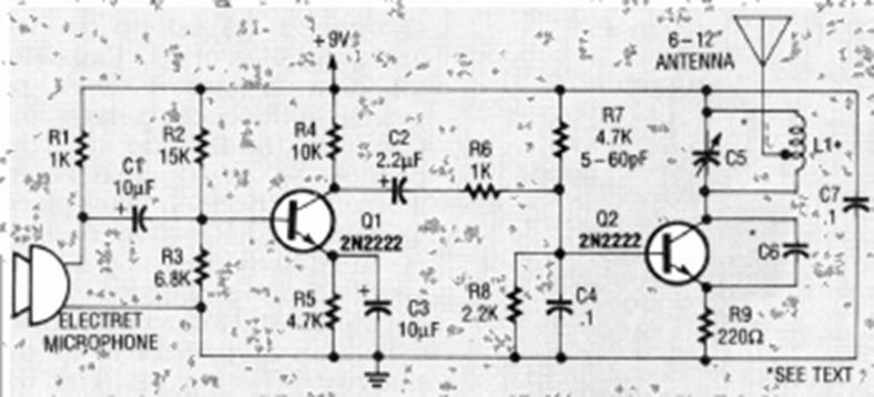 We found this circuit in the Electronics Experimenter Handbook magazine from 1993. L1 has 2 = 2 turns of 28 or 30 wire in the shape of 0.5 cm without core. The range reaches a few tens of meters.