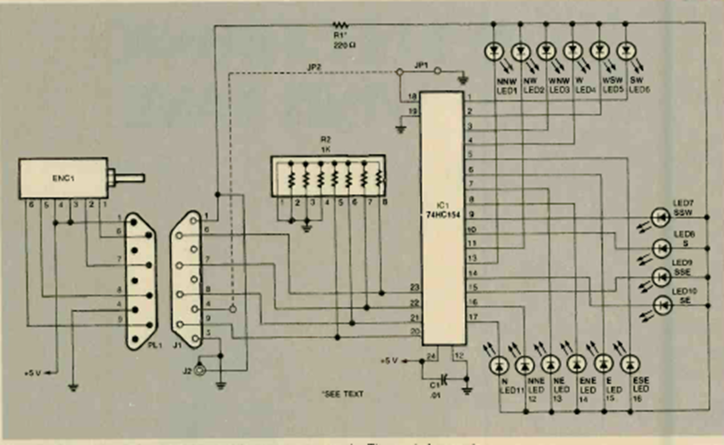Found in the September 1998 issue of Electronics Now, this circuit uses an encoder with reed switches. The circuit indicates the position of a “indicator” and thus the direction of the wind.