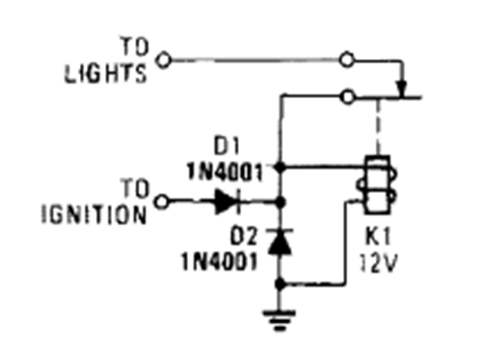 This circuit warns you if you forget to turn off the car light and leave it. The circuit is from a Popular Electronics from the 90s. The relay is low-power.