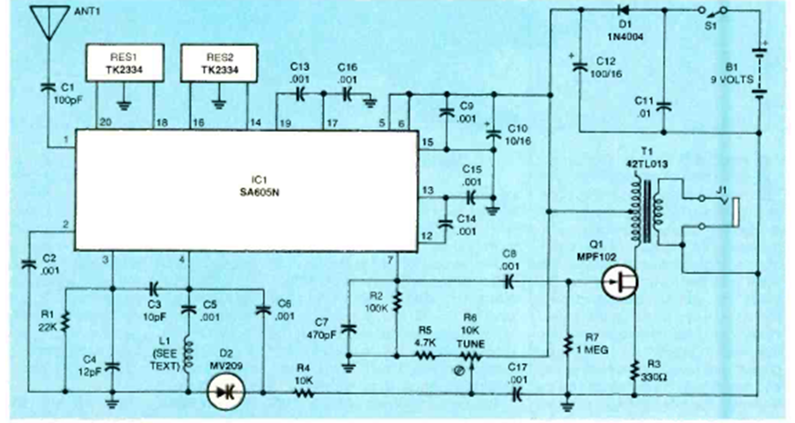 This circuit was found in the January 1999 issue of Electronics Now magazine. The circuit uses an integrated circuit from the period and has earphone listening.