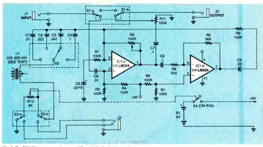 This circuit was found in the September 1999 issue of Electronics Now magazine. The circuit is based on common operational circuits and produces various effects for the sound of guitars.