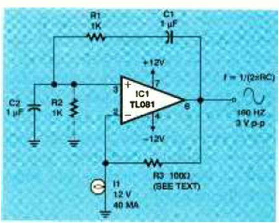 This oscillator for sinusoidal signals uses a lamp as a stabilizing element. We found it in the March 1997 Electronics Now magazine. The configuration applies to other operational amplifiers.