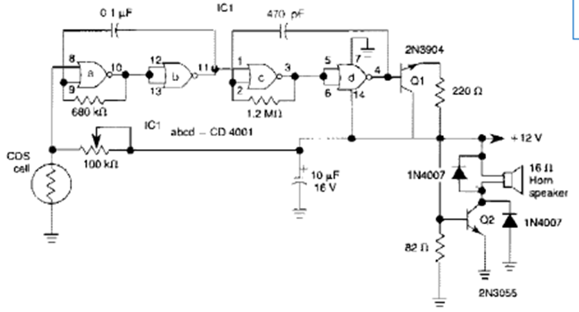This circuit was obtained from the 1995 Encyclopedia of Electronic Circuits Volume 5. The circuit uses a CMOS 4001 and has a transistor power stage.