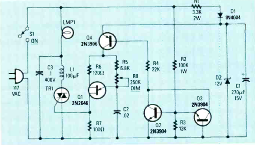 The circuit is from a Radio Electronics magazine from October 1987. The Triac must be equipped with a heatsink and the transistors are general purpose.
