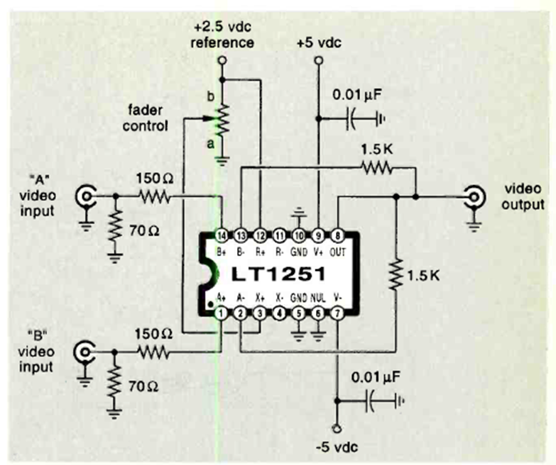 This analog video fader circuit smoothly transitions between two signals. It was found in the April 1997 issue of Electronics Now.