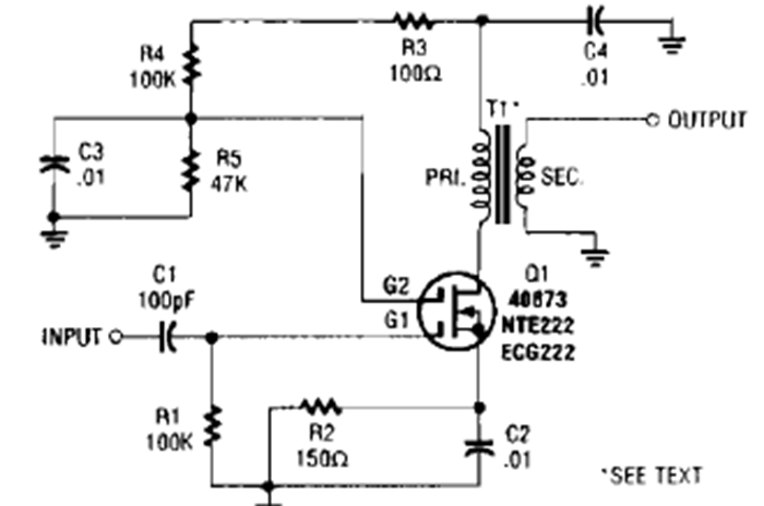 This boost amplifier was found in a Popular Electroniics from the 90s. The circuit operates up to 20 MHz depending on the coils used.