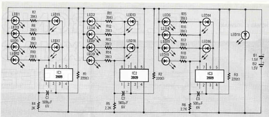 This flashing allegory with 555 integrated circuits was found in the Radio Electronics Experimenter magazine from 1989. It is a simple circuit to assemble.