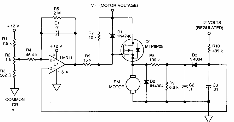 This circuit was found in Motorola documentation from the 80's. The MOSFET admits equivalent according to the current and voltage of the motor that must be controlled.