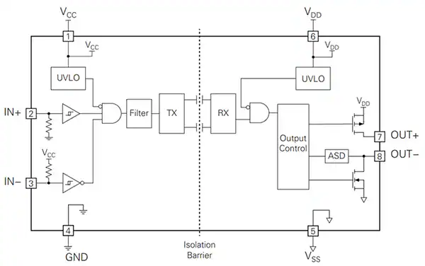 IXYS IX3407B Isolated Single-Channel Gate Driver provides a typical 7A peak source and sink output current on separate output pins. Galvanic input-output isolation is provided by an isolation technique where the low-voltage transmitter die and a high-voltage receiver die are isolated by integrated high-voltage capacitors. Logic inputs on the IXYS IX3407B are tolerant to input voltages up to VCC and employ TTL voltage thresholds to support a wide range of control logic devices powered by as low as 3.3V. Under Voltage Lockout (UVLO) circuitry protects both the input and output sides. An active shutdown feature also protects the power transistor by pulling OUT-low in case of an output side voltage supply loss.