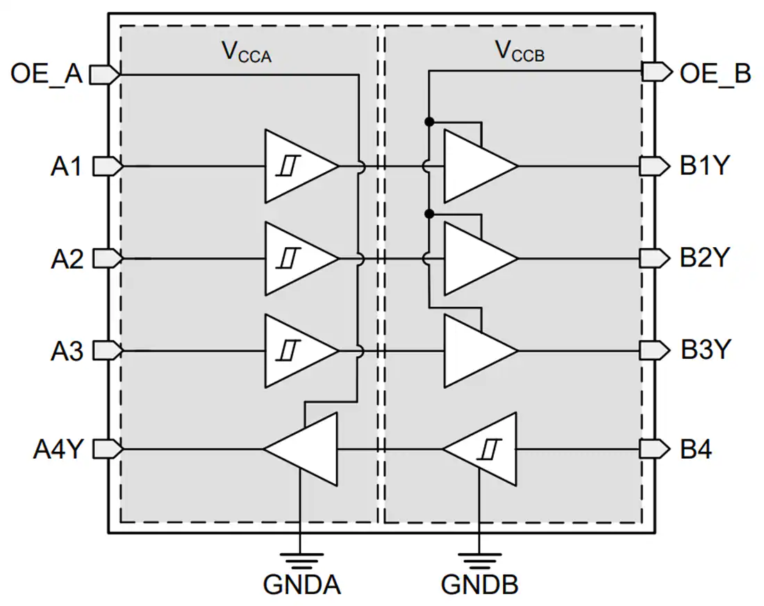 Texas Instruments TXG104x 4-Bit Ground-Level Translator is a fixed-direction, non-galvanic-based voltage and ground-level translator supporting logic-level shifting between 1.71V and 5.5V and ground-level shifting up to ±10V. Compared to traditional level shifters, the TXG104x family can solve the challenges of voltage translation across different ground levels. VCCA is referenced to GNDA, and VCCB is referenced to GNDB. Ax pins are referenced to the VCCA logic level, while Bx pins are referenced to the VCCB logic level. Both A port and B port can accept voltages from 1.71V to 5.5V. This device includes two enable pins that can place the respective outputs in a high-impedance state when the OE pin is connected to GND or left floating. In the event of input power or signal loss, the output is set to a default low when OE is High. The leakage between GNDA and GNDB is < 30nA when VCC to GND is shorted.