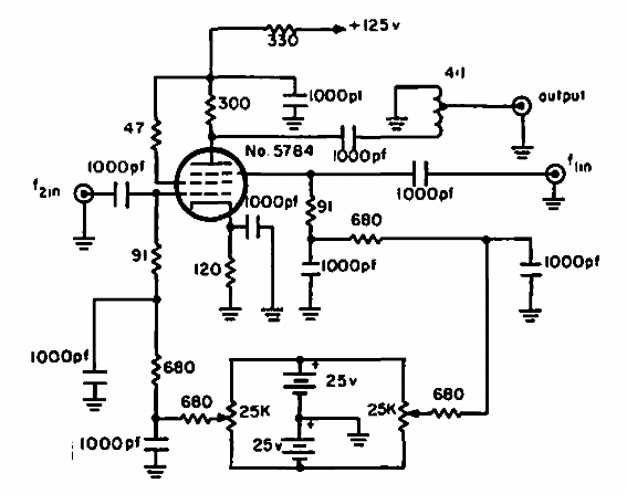 This circuit is from 1964 documentation. Its purpose is to mix RF signals to obtain the beat frequency in communications applications.
