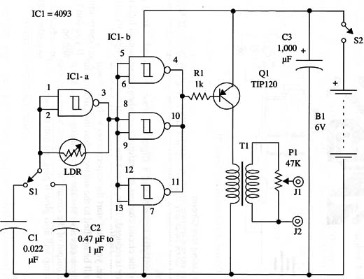 The circuit uses the same oscillator stage as the previous projects. One NAND gate of the four existing in a 4093 IC is used to produce pulses at a rate determined both by C1 or C2 and the resistance of an LDR or CD5 cell.