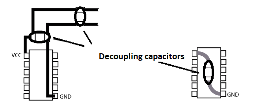 Many digital circuits (TTL, CMOS, microcontrollers, and shields) once assembled have instabilities with random drives and operation. This occurs in microcontrolled designs, timers, sensor circuits, priority switches, etc. One cause of instability may be the need for decoupling of the integrated circuit power pins. This can be done by attaching a 100 nF ceramic capacitor between the positive power pin and the negative or zero volt power pin of the IC as shown in Figure 2.