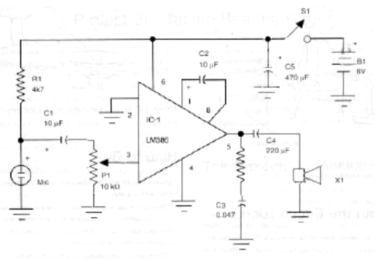 The amplifier can he the same one used in our first project and in the bionic ear, the unit using the LM386 integrated circuit (IC). It is an easy-to-find part and will have enough gain for the application we have in mind.