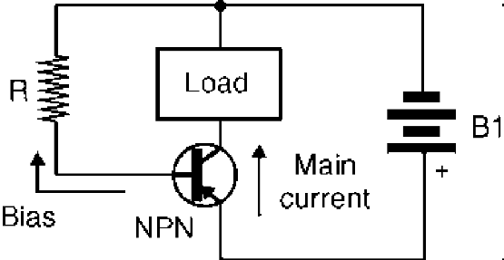 On the other hand, the PNP transistor conduces a large current between the emitter and collector (the reverse direction as compared with an NPN transistor) when the base is made negative with respect to the emitter, as shown by the Figure 3. The voltage source must have the positive side connected to the emitter and the negative to the collector. The load to be controlled by a transistor can be installed between the collector and the power supply or between the emitter and power supply as shown by figure 4.