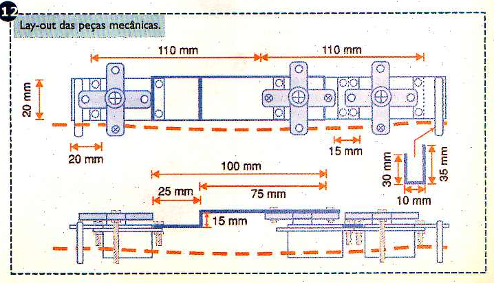In Figure 12, we have the "lay-out" of the robot with the measures of the parts, to facilitate the assembly. It is highly advisable that the reader assemble all the necessary parts, make the bends and holes in the metal part, assemble the supports for the cable with the pieces of printed circuit and the wire, etc. The material list contains everything the reader will need.