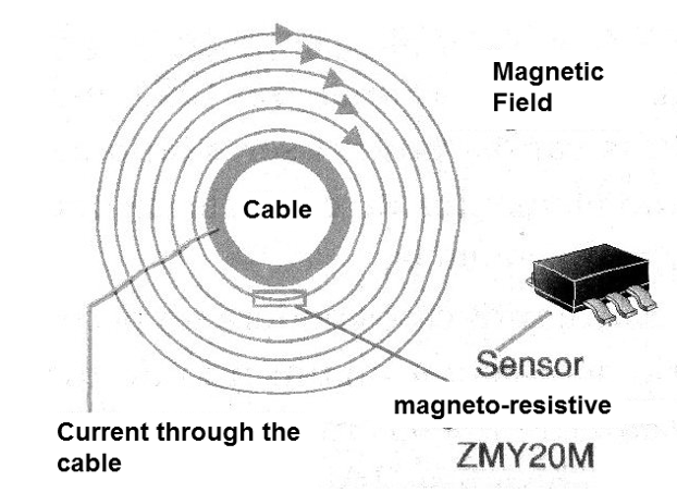 In this case we used the current sensor ZMC05, which internally contains a conductor that generates a field sensed by the magneto-resistive bridge. The circuit intends to measure currents up to intensity of 5 A.