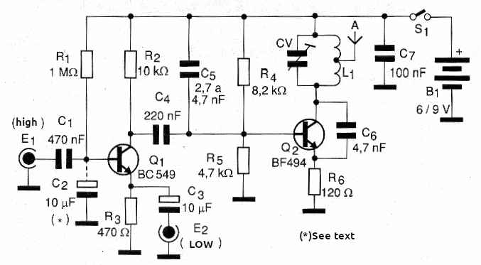 In figure 1 we have the complete diagram of the wireless guitar that uses two transistors.
