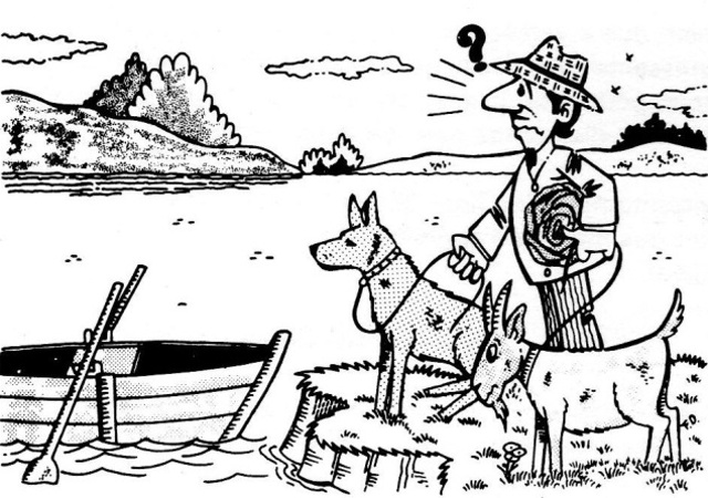 f) Returning alone, the man can take the goat, completing the transport of the three passengers as was desired. (Figure 14)