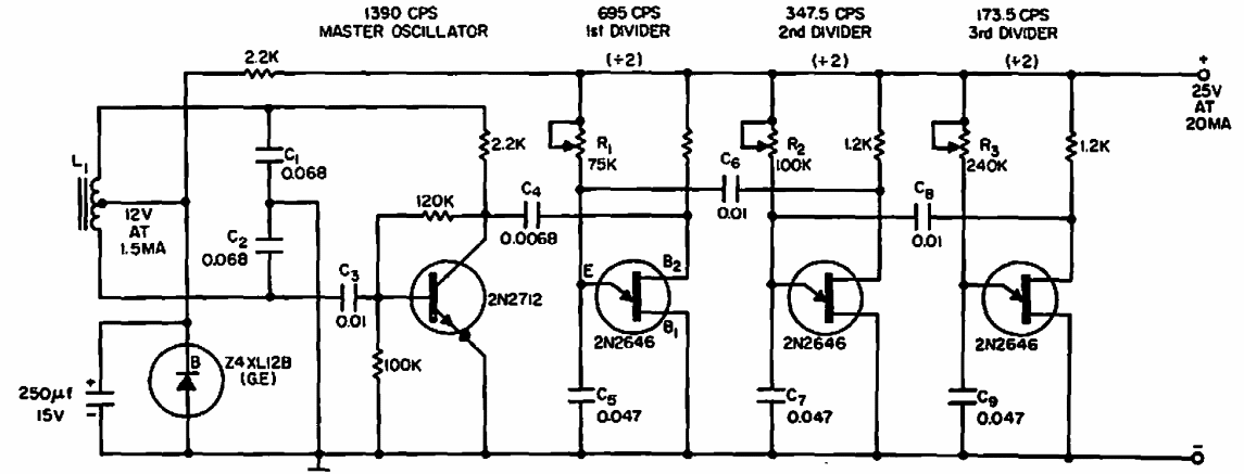 Found in a 1965 Electronic Design, this circuit divides the frequency of a cascaded signal using unijunction transistors. The bipolar transistor supports an equivalent. The shock is 470 mH.