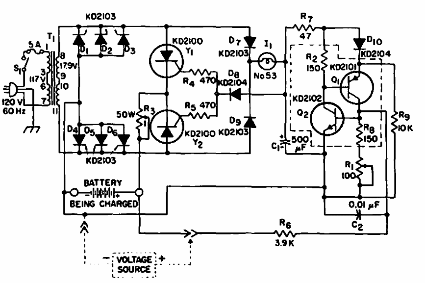 Taken from a 1967 RCA publication, this circuit maintains a low current in the battery when it is charged. The components are from the era.