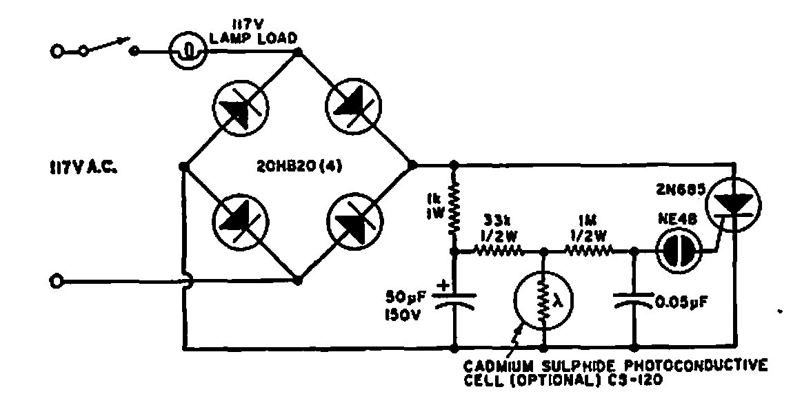 Found in an Electronics World of 1968 this circuit can use current SCRs and the diodes are according to the lamp. The Circuit only works with incandescent lamps.