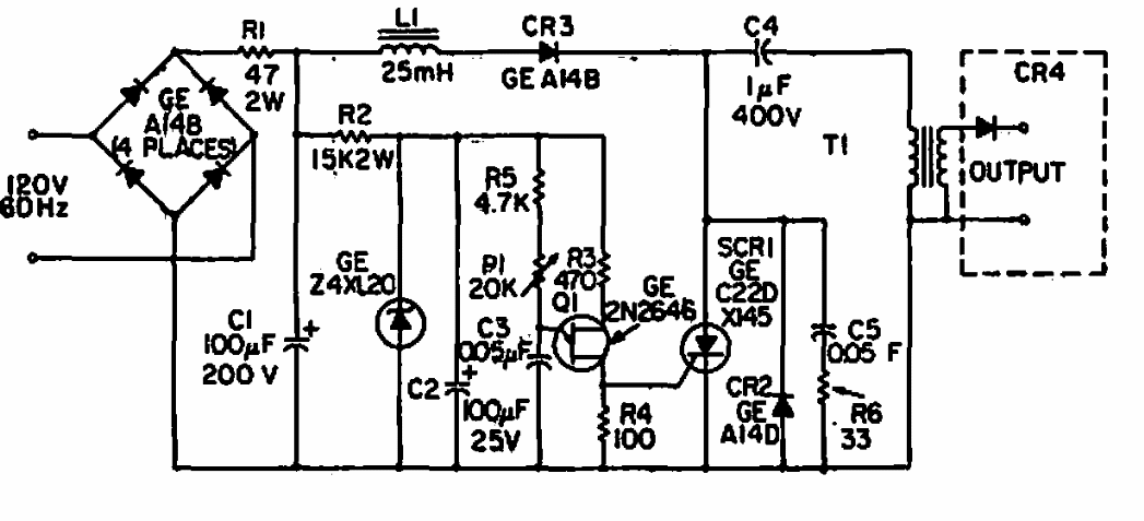 This circuit was originally suggested by General Electric in 1966 documentation to power decorative high voltage neon lamps. The transformer is 7,500 V for a current of 4 mA.