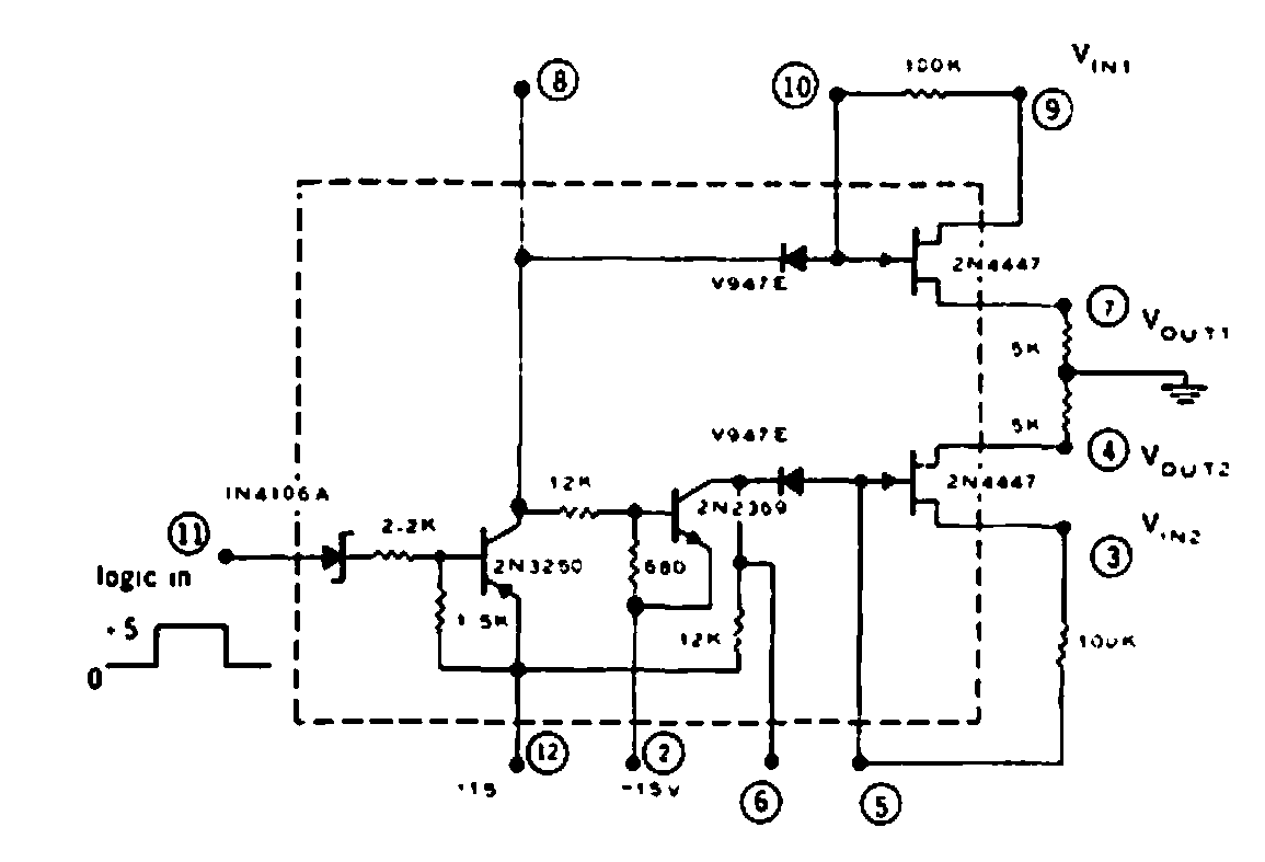 This old version of analogue switch was found in a 1969 documentation. Components of the time are used, with emphasis on the CAG7 integrated circuit. It is worth as a reference.