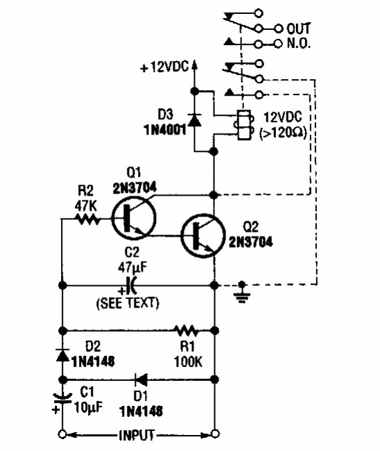 In the figure we have the trip circuit for a relay with audio signals. The circuit is from an 80's Radio Electronics. The relay is of the sensitive type of 12 V. For shooting with microphone use the following circuit.