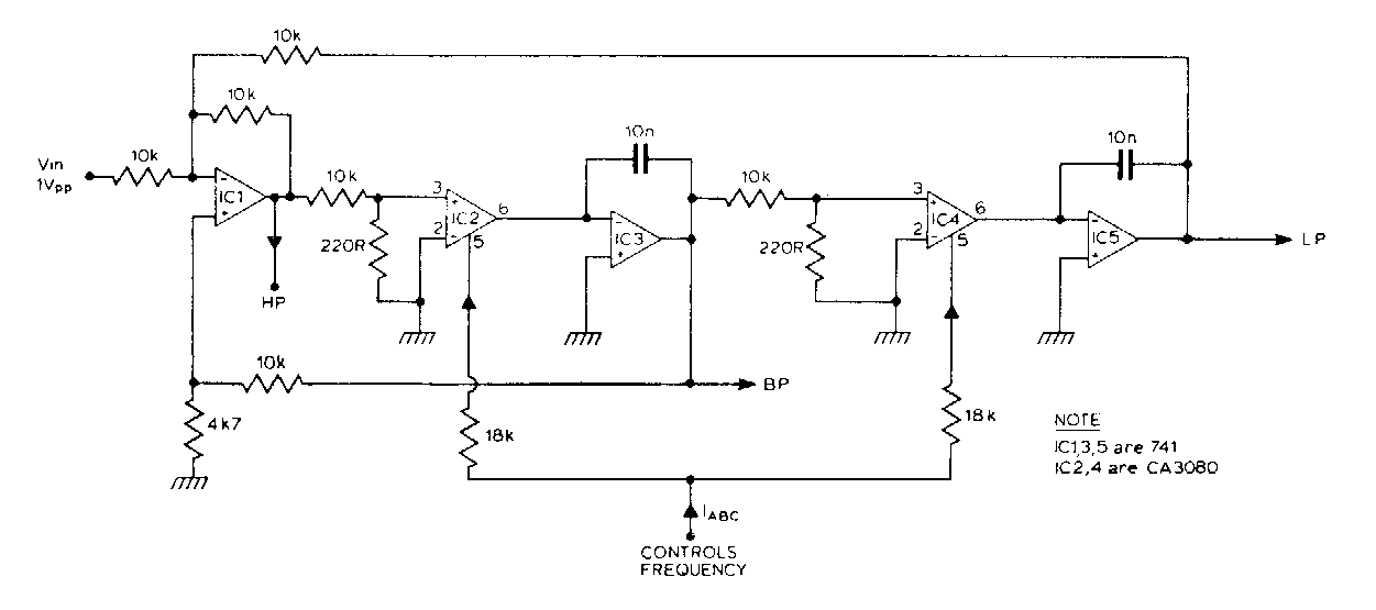 This filter was found in an 80's English publication. However, it can be implemented with modern operating systems. The circuit can tune frequencies in a range from 10,000 to 1.