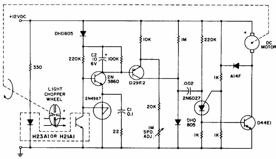 We found this circuit in a publication by General Electric in the 1980s. The transistors and the PUT are from that time. The control is done by a tachometer based on an optical coupler.