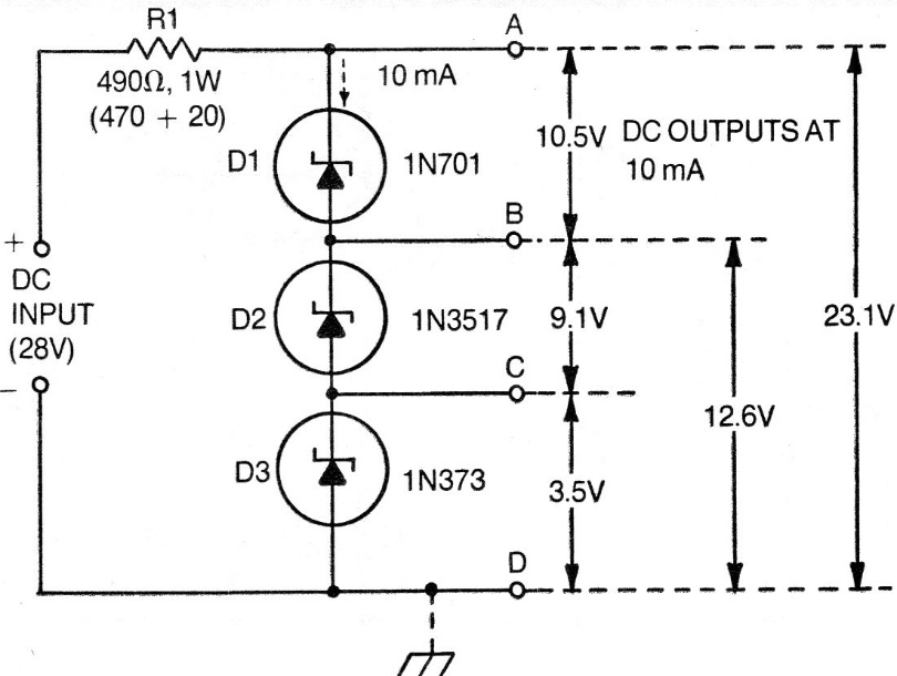 The circuit shown, from an American technical documentation from 1976, is a voltage divider using zener diodes. The circuit can be modified to obtain other voltages, using appropriate diodes. The current is low, as indicated and the input resistor can eventually be recalculated for other applications of higher or lower current. The zener diodes are 1 W.