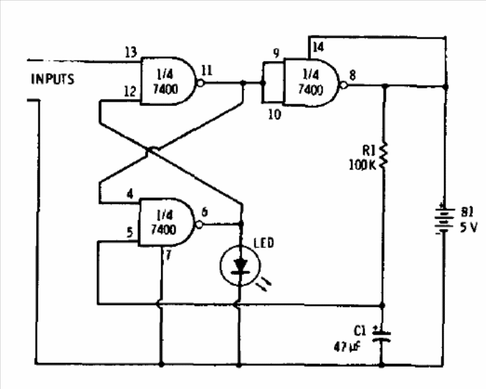 This monostable circuit, from a 1977 Radio Shack documentation, uses a 7400. The time is given by the capacitor and the power must be supplied with 5 V.
