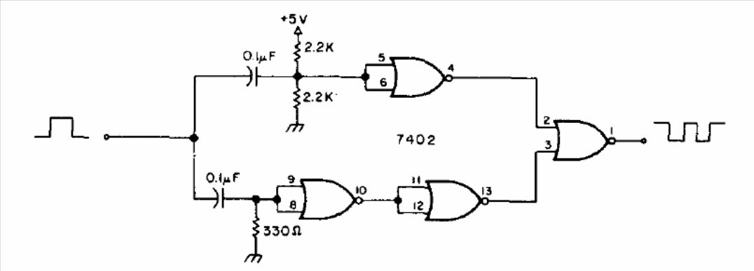 This circuit that can be used as a shield doubles the frequency of a square signal. The supply must be made with a voltage of 5 V. The circuit was obtained in a technical documentation of TTL integrated circuits.
