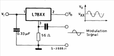 With this circuit it is possible to obtain a voltage modulated in amplitude with a maximum current of 1 A using audio signals, as shown in the graph next to the circuit. The L78xx is equivalent to the common 78xx and the circuit was found in the 1982 SGS Linear Integrated Circuits manual. The integrated circuit must be mounted on a heat radiator.