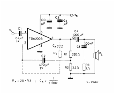 This car amplifier was found in the 1982 SGS Linear Integrated Circuits manual. The circuit can be powered by voltages from 8 to 18 V and the load impedance can be between 2 and 8 ohms. The printed circuit board is given next to the diagram.