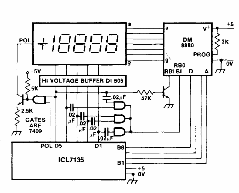 This circuit is from the 1983 Intersil Databook. The display is plasma and must be excited by a high voltage circuit. The components used in this configuration are not common today.