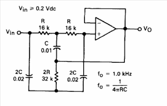 This 1kHz rejector filter can be modified to operate at other frequencies. Operational can be just about anyone. The circuit is from Motorola's 1990 Linear Databook.