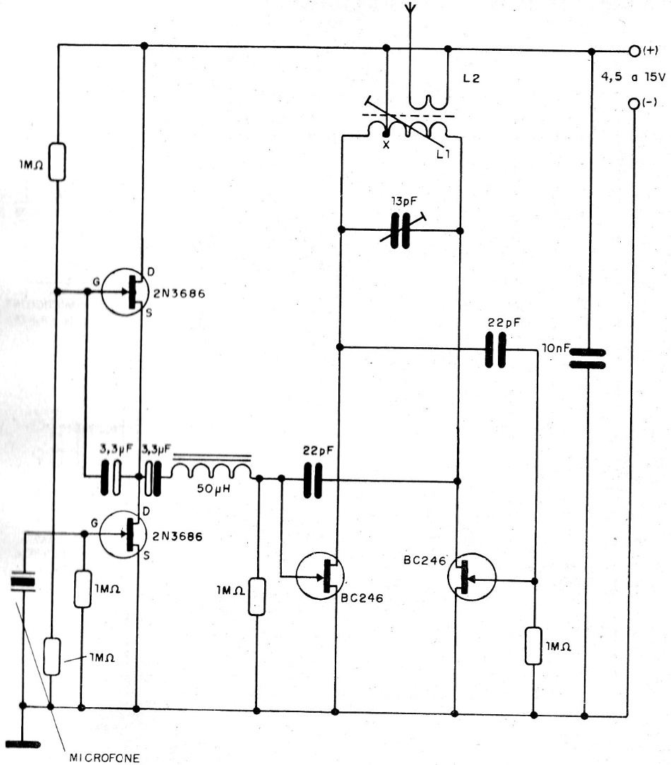 This transmitter for the FM band was found in a 1993 spy documentation. The coil consists of 2 + 4 coils of wire 26 or 28 in the form of an adjustable 0.8 cm ferrite while L2 is made up of 3 coils on L1. The circuit has a range that can reach 1 kilometer under favorable conditions.