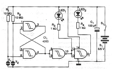 In the figure we have a bistable circuit that activates LEDs from touch rings and turns off data on the sensors. Evidently, the circuit can be easily changed to control higher power loads with the use of transistorized steps by activating relays or directly the loads. Likewise, we can use common NA sensors to apply the circuit to smart controls, alarms, and other similar applications. In this circuit, two of the four ports are used in a flip-flip while the others drive the LEDs. Resistors R1 and R2 determine the sensitivity of the circuit and their values may be increased. The supply can be done with voltages from 6 to 12 V, without problems. Experimental setup can easily be done in a contact matrix. The sensors are two separate metal plates so that they can be touched at the same time.