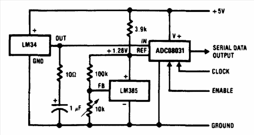 This circuit provides a digital output on the Fahrenheit scale with a maximum value of 128º F using the LM34, which is not a simple component to obtain, just like the other semiconductor devices. The circuit is from 1994 National Semiconductor technical documentation.