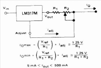 We find the LM317 integrated circuit in the catalog of several manufacturers. The circuit shown is from the Motorola Linear Databook of 1990. The formulas for calculating the components for a given current are next to the diagram.