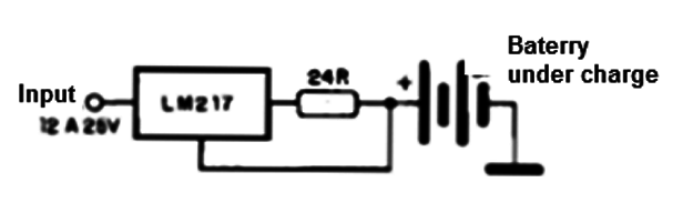 This simple circuit is designed to charger AA or AAA Nicad batteries. Current can be changed replacing the resistor. For more than 100 mA the integrated circuit must be mounted on a heatsink.