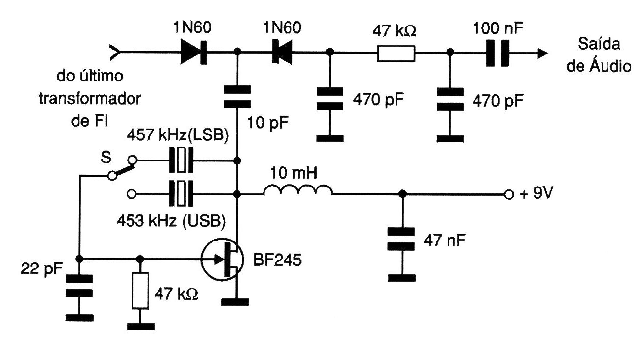 This circuit decodes signals received in SSB (Single Side Band) obtaining an audio signal for application in the amplifier stages. The key selects whether the decoding is USB (Upper Side Band) or LSB (Lower Side Band). The circuit is powered by 9V and can be adapted to communications receivers with 455 kHz FI. For other IF frequencies the crystals must be changed. The field effect transistor, like the diodes, accepts equivalents, and the signal is taken from the receiver's last IF transformer.