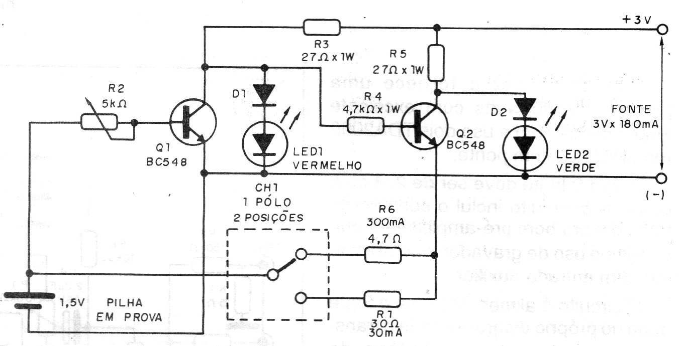 This simple battery tester uses two transistors to drive LEDs of different colors, indicating the status of common batteries type AA, C or D. The circuit is powered by an external source and performs the test under load. We found this circuit in an old documentation.