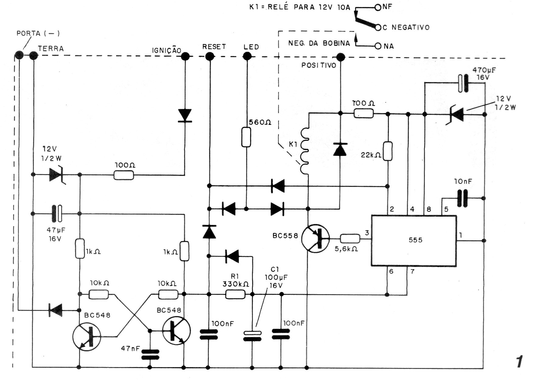 This article, from a 1994 publication, applies to old cars that have contact breaker, but can be adapted to work with modern vehicles. The circuit blocks the electrical part of a car and can be used as part of an anti-theft system. The circuit uses components that are still common in our market.