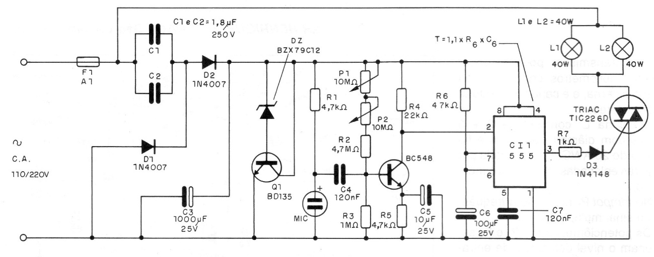 The idea of this circuit is simple. Installed in a place where it is desired to be silent, it detects when the noise level increases and makes a light with the word SILENCE turn on. The circuit uses a microphone as a sensor and the warning has common incandescent lamps. The trigger level is adjusted in two trimpots. The triac that controls the lamps must have a heat sink.
