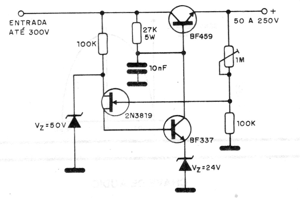 This circuit can supply a voltage of 50 V up to 25mA or 250V with up to 120 mA at a regulation rate of the order of 0.5 ° / o. The BF459 power transistor must be mounted on a heat radiator and among the possible applications for the circuit is the supply of deflector systems for oscilloscopes or video monitors. 2N3819 can be replaced by equivalents.