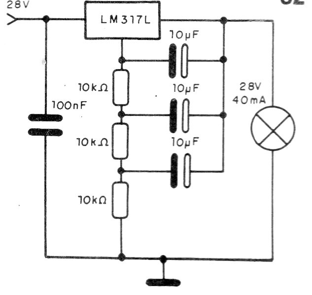 This circuit shows how to use a 3-terminal voltage regulator as a low frequency oscillator by controlling a small 28 V x 40 mA incandescent lamp. The frequency of the blinks is given by the capacitors and changes can be made to find lamps of other voltages.